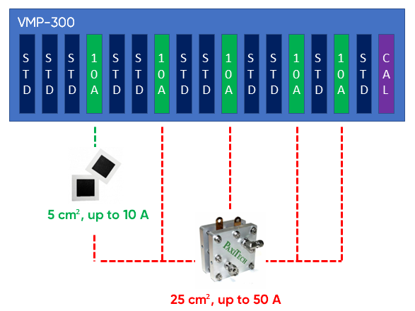 Let’s consider a user working with a VMP-300 chassis in his laboratory. She initially wants to perform experiments on a LIR2032 coin cell that has a capacity of around 30 mA h: a standard channel board can be used for such a purpose. However, sometime later, the same user wants to work with a 26650 cylindrical type battery that has a capacity of around 3 Ah. So, she inserts an additional 10 A booster board in the potentiostat/galvanostat to increase the current range up to 10 A. But she still needs additional power to study a 30 Ah pouch cell so an additional three 10 A booster boards are added to the VMP-300 chassis in parallel.
