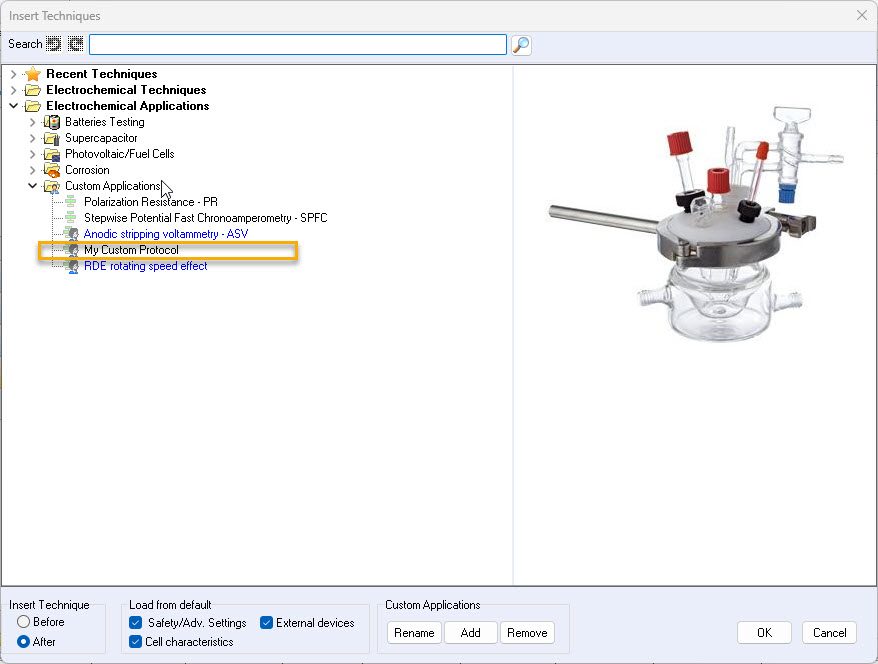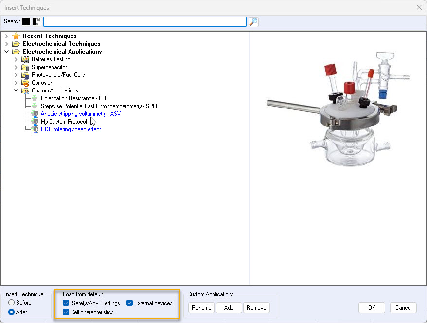 Experimental protocols consist of more than just a combination of techniques, they also include external device configuration, cell characteristics, advanced settings, and safety limits. When loading a protocol from a custom application (or a simple technique), users can selectively choose which settings to retain by checking or unchecking the corresponding boxes. This allows you to maintain consistent settings across identical cells or modify parameters for individual cells as needed. With the same logic, an external device such as a Rotating Disk electrode can be set and included in the custom technique.