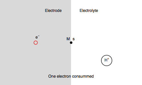 Where $\text s$ is an adsorption site and $\text{H, s}$ is a proton adsorbed on the electrode surface.