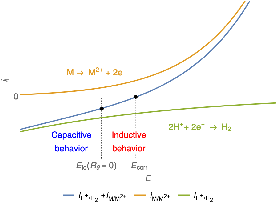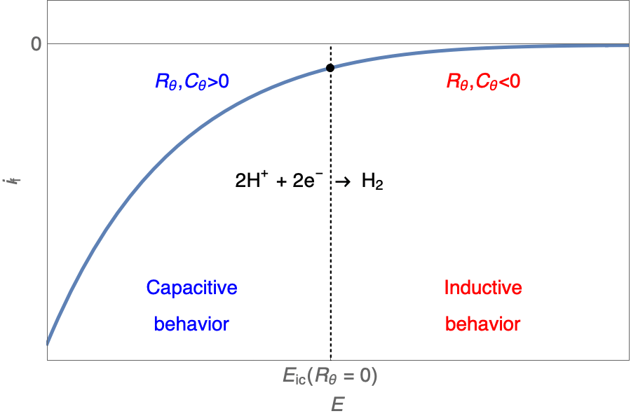In the case of $R_\theta, C_\theta \gt 0$, a capacitive behavior can be observed on the Nyquist plot. In the case of $R_\theta, C_\theta \lt 0$, an inductive behavior can be observed. For a potential around $E_\text{corr}$, the Nyquist diagram shows an inductive behavior.