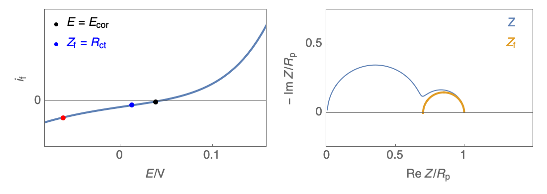 In our case, the impedance equivalent circuit has an inductive loop at low frequencies, and it does not follow the Wagner-Traud relationship, $R_\text p \neq R_\text{ct}$. So, the Stern-Geary relationship is not valid anymore.