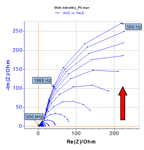 The Mott-Schottky relationship involves the apparent capacitance measurement as a function of potential under depletion condition (state where the semiconductor is fully depleted of majority carriers within the space charge region). You can learn how to perform Mott-Schottky in our dedicated and how to follow the values of all the elements of the equivalent circuit as function of the voltage with our EIS fitting tool Z Fit.