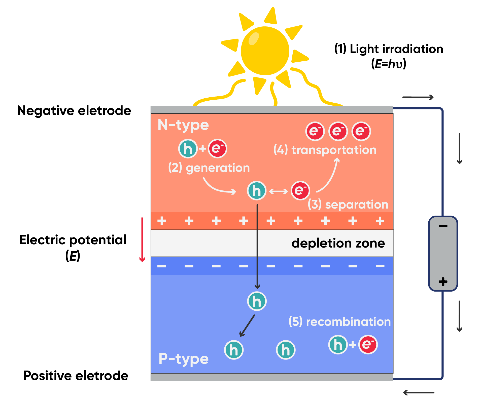 PV devices are made of semiconductor materials, usually silicon, that feature a precisely designed internal asymmetry created through selective doping of different regions with specific impurities. When photons from sunlight strike the solar cell, they transfer their energy to electrons in the semiconductor material, elevating these electrons to higher energy states and creating electron-hole pairs. Unlike in homogeneous materials where these excited electrons would simply relax back to their ground state, the cell asymmetry (interface between differently doped semiconductors region) prevents recombination by effectively separating the charge carriers (i.e. electrons and holes). The built-in electric potential difference drives the electrons through an external circuit, resulting in an electric current that can power external devices.