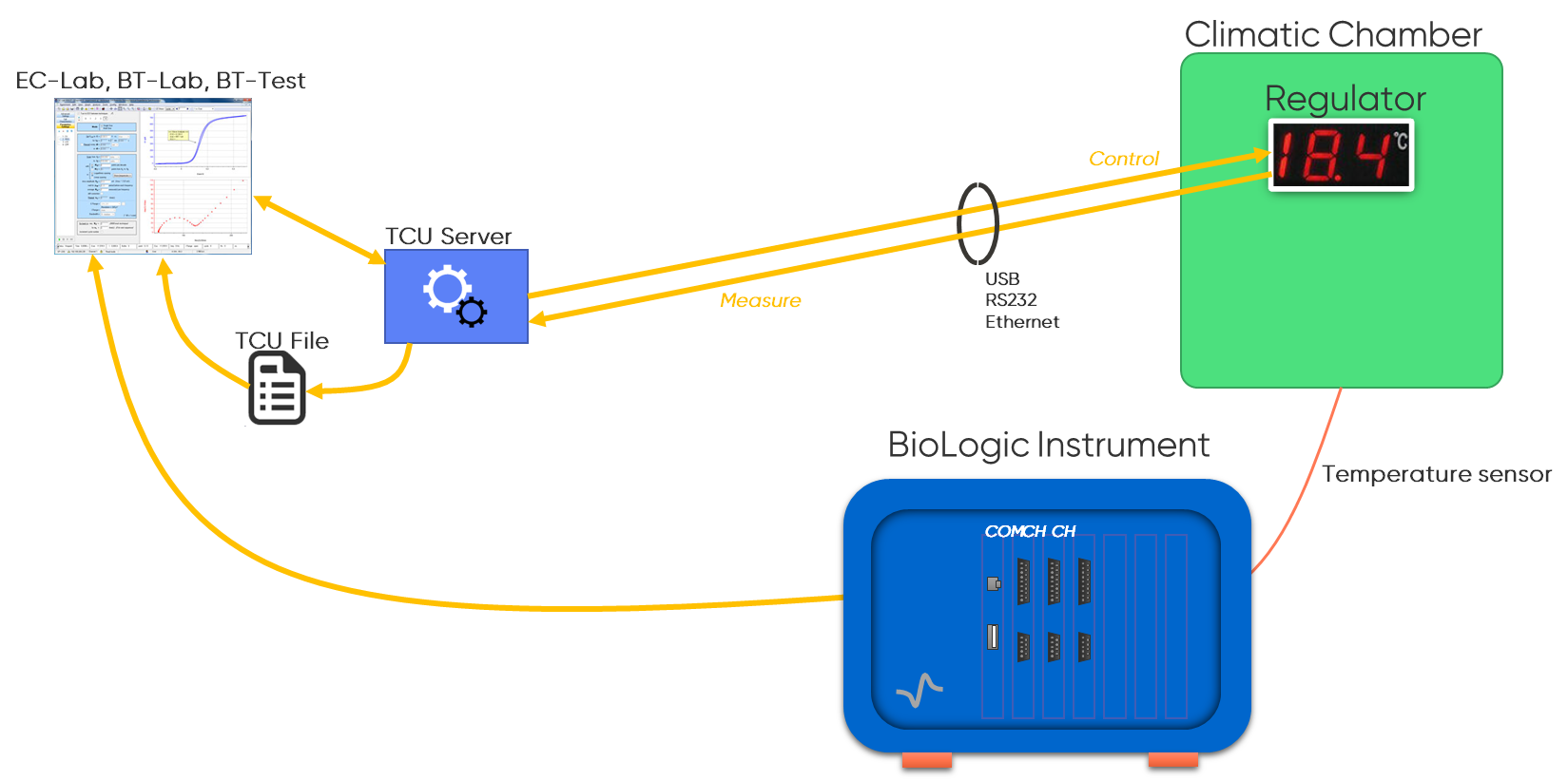 BioLogic systems integrate temperature chamber control through the TCU Server, which provides direct integration between the instrument and a programmable thermal chamber, providing a closed feedback loop for temperature regulation.