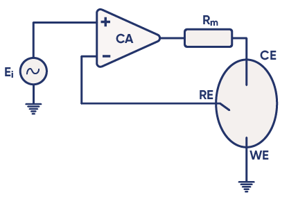 Feedback Loop: The voltage from the reference electrode is fed back to the control amplifier to maintain the setpoint. This creates a loop called the “negative feedback loop”, which allows the control amplifier to adapt its output and maintain a potential difference corresponding to $E_\text i$. For more information, see the BioLogic Application Note #04: “The mystery of potentiostat stability explained”.