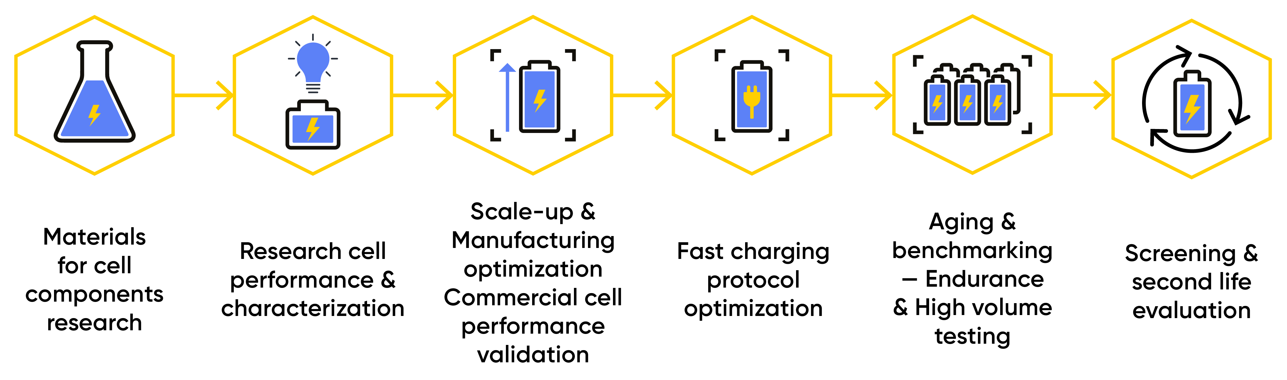- Evaluating cycle life and degradation behavior including State of Charge (SoC), State of Health (SoH)