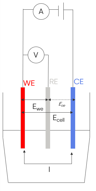 A 3-electrode setup is composed of a working electrode (WE), a counter electrode (CE) and a reference electrode (RE), the latter enables the study of the processes at each electrode separately.