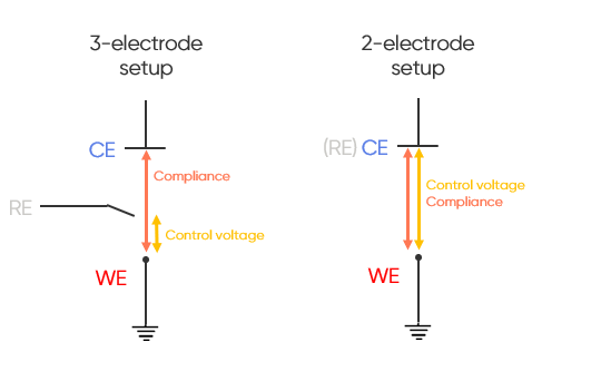 Note: In a 2-electrode setup, the control voltage, the cell voltage and the compliance voltage are one and the same.